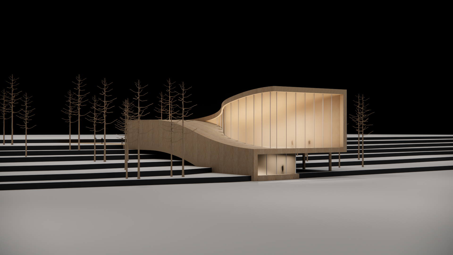 ผังพื้นฐานเป็นสี่เหลี่ยมผืนผ้า ใช้เส้นโค้งในการแบ่งผังสี่เหลี่ยมผืนผ้าออกเป็นสองส่วน โดยให้มีสัดส่วน 70% และ 30% ด้านที่เป็น 30% ให้บิดไหลลงตาม Slope ของ contour เพื่อให้เกิดความสูงต่ำที่น่าสนใจ ด้านที่เป็น 70% ให้บิดขึ้น เพื่อเพิ่มมิติของอาคาร บริเวณที่มีการบิดขึ้นและลงนั้นเจาะช่องเปิดขนาดใหญ่ เพื่อให้ mass ถูกแยกออกจากกันอย่างชัดเจน ส่วนปลายอีกด้านที่ไม่ถูกบิด ทำเป็นกรอบสี่เหลี่ยมผืนผ้า เพื่อเน้นให้เห็นชัดเจนว่าเป็นทางเข้า
